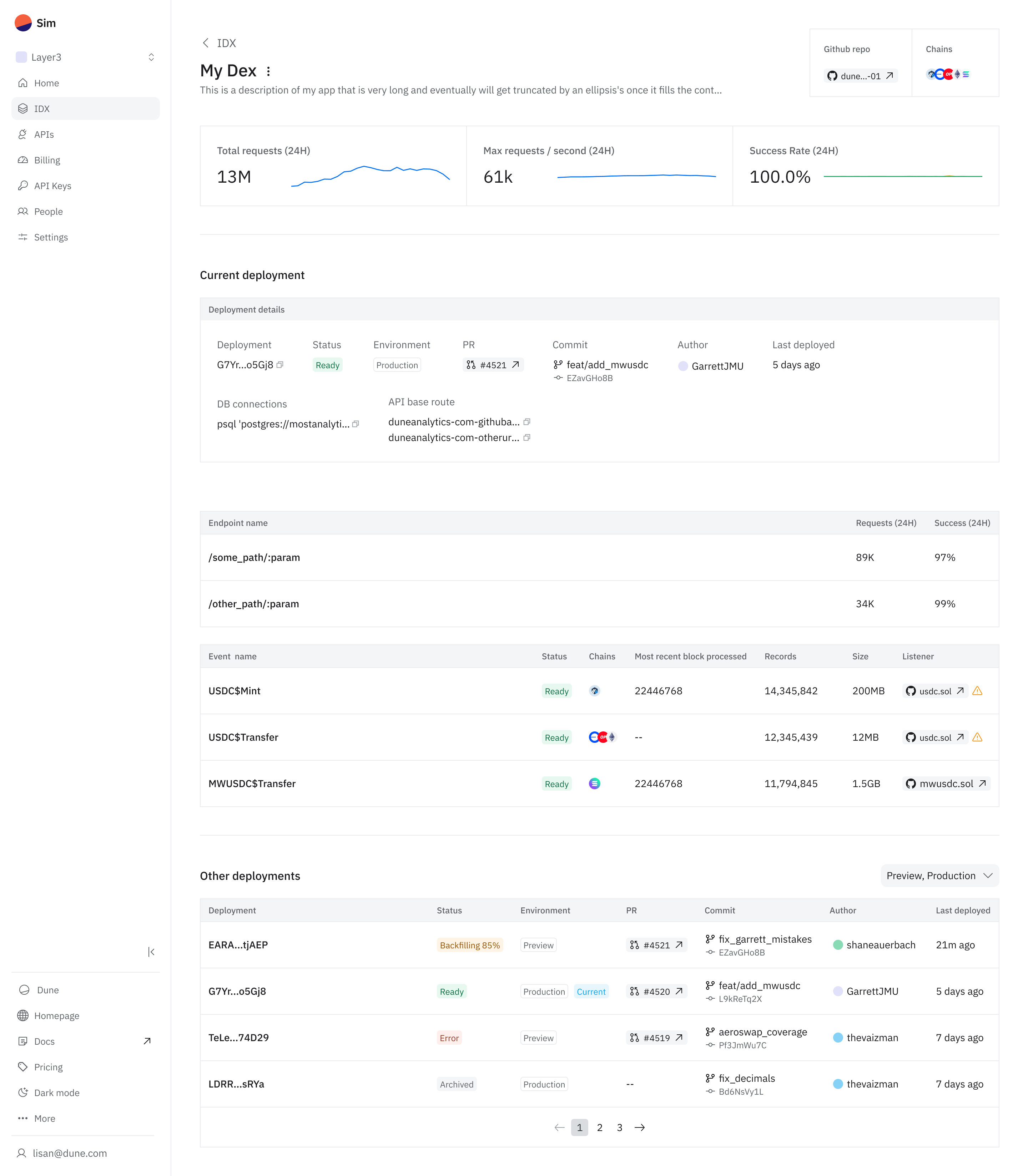 At the very top you will see a stats bar that summarises your app’s activity: the chains it indexes, the connected GitHub repository and API metrics such as total requests, peak RPS and success rate over the last 24 hours. The numbers update live so you can leave the tab open while you ship new endpoints.Current deployment