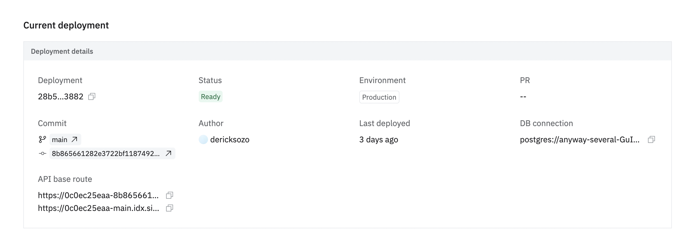 When you push commits to themain branch, Sim IDX creates production deployments. Each production deployment receives: